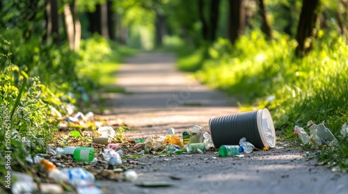 © AzSteel, Fototapeta premium Litter along a suburban park path in natural light