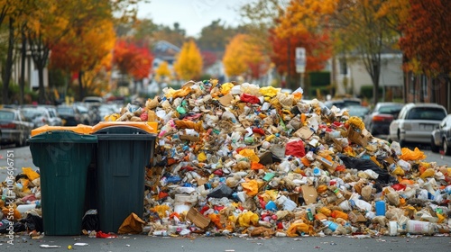Fototapeta premium Littered Street with Large Pile of Waste Amidst Autumn Trees
