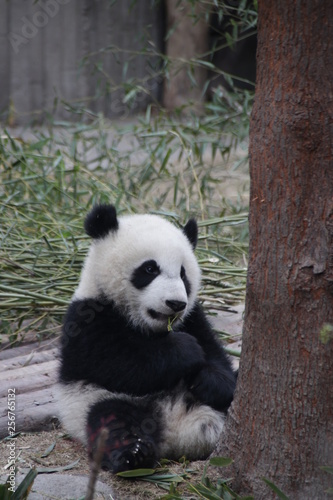 © foreverhappy, Fototapeta premium Little Baby Panda Having Fun with Bamboo in his Playground, Chengdu, China