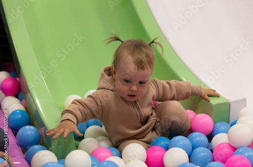 Obraz premium Little baby slides down a slide into a dry pool with balls at a children's...