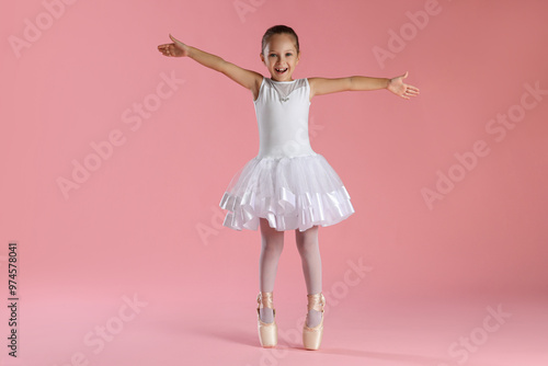 Naklejka premium Little ballerina practicing dance moves on pink background