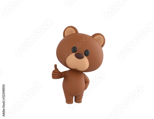 Fototapeta premium Little Bear character showing thumb up with right hand in 3d rendering.