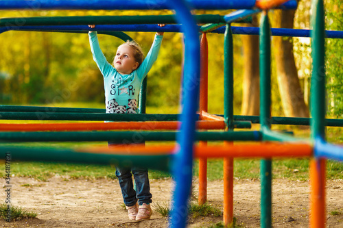 © Botygin, Obraz premium Little beautiful girl on a walk between the colored maze