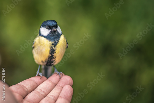 © vadimalekcandr, Fototapeta premium Little bird tit sitting on the outstretched palm