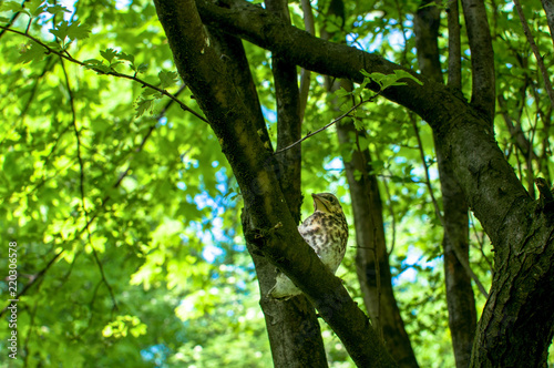 Fototapeta premium Little birdy sitting on the tree under green leaves