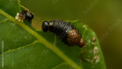 © DiazAragon, Fototapeta premium Little black caterpillar walking on green leaf