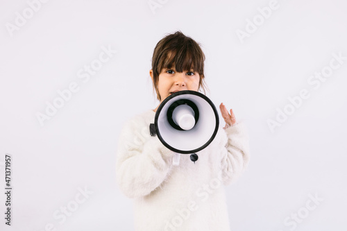 © Davidbenito, Fototapeta premium Little black haired girl wearing white sweater with bow tie, speaking through a white megaphone.