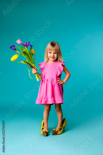 © Tina kids photo, Fototapeta premium little blonde girl in big yellow shoes and a pink dress is holding spring flowers, baby girl in a pink dress and mother's shoes smiling on a blue background, a little fashionista. space for text