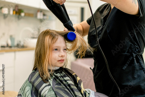 Naklejka premium Little blonde virgo girl getting a haircut at a beauty salon