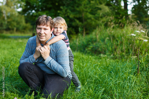 © Irina Schmidt, Fototapeta premium Little boy and his father sitting on grass in summer forest