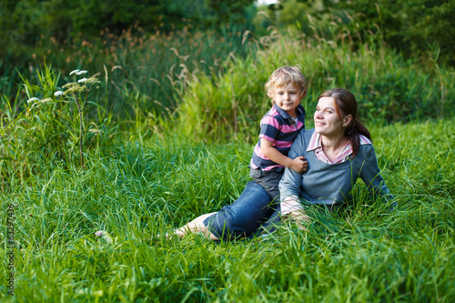© Irina Schmidt, Fototapeta premium Little boy and his mother sitting on grass in summer forest