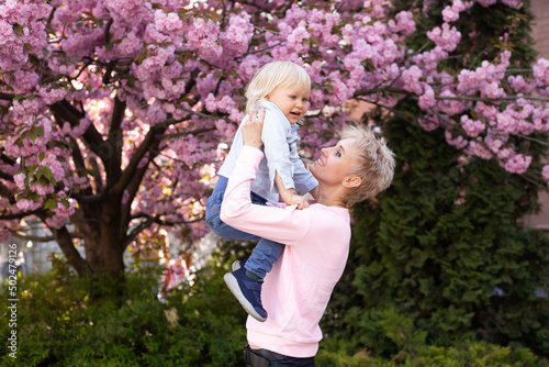 © Marharyta, Obraz premium Little boy and mother have a good time on weekend activity in the blooming Sakura gardens. Mom and little son in nature playing at spring park.