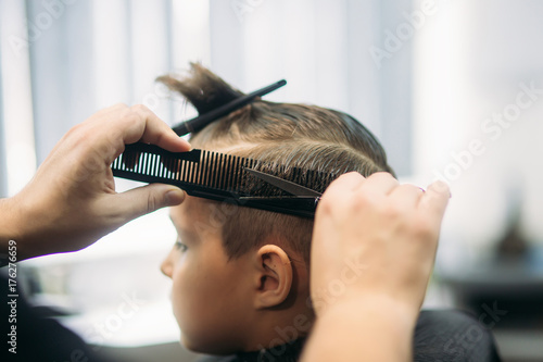 Fototapeta premium Little Boy Getting Haircut By Barber While Sitting In Chair At Barbershop.