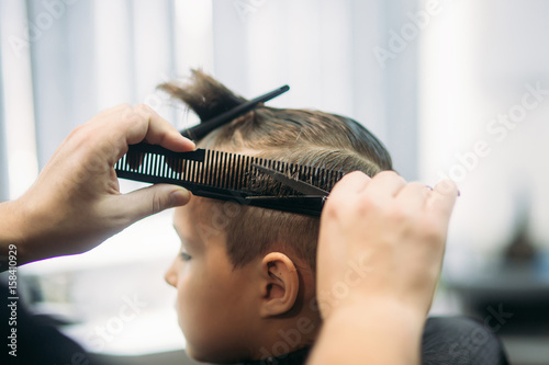 Fototapeta premium Little boy on a haircut in the barber sits on a chair.