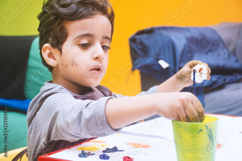 Obraz premium little boy painting sketchpad with a brush and water color paint, close up of...