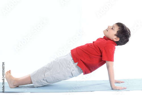 © yurolaitsalbert, Obraz premium little boy performs morning health gymnastics.isolated on white