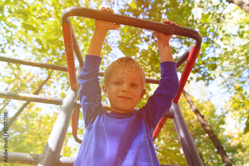 Fototapeta premium little boy playing on monkey bars, kids sport