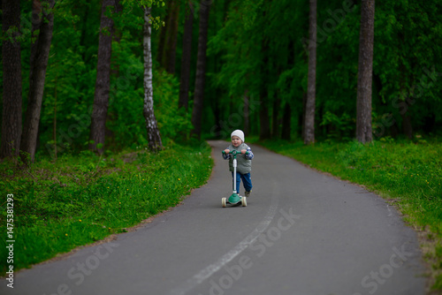Fototapeta premium Little boy riding a green scooter on a paved path through a lush forest. Child dressed in a vest, beanie, and sneakers enjoying outdoor playtime in nature. Fun and active childhood moment.