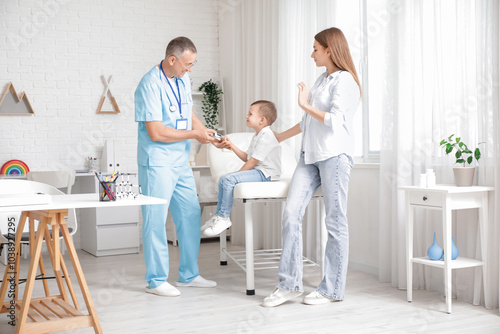 © Pixel-Shot, Obraz premium Little boy with mother at pediatrician's office