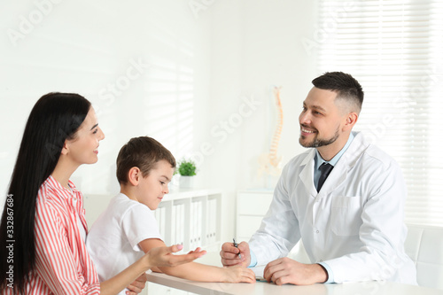 Fototapeta premium Little boy with mother visiting orthopedist at clinic