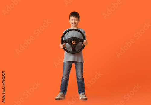 © Pixel-Shot, Fototapeta premium Little boy with steering wheel on color background