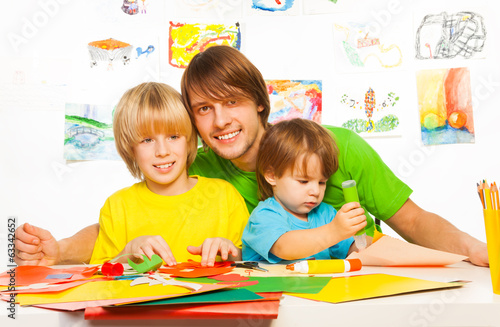© Sergey Novikov, Fototapeta premium Little boys and father craft with glue