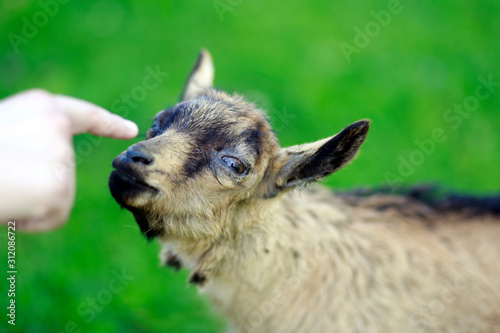 Fototapeta premium Little brown goat farming field pasture landscape mammal meadow.