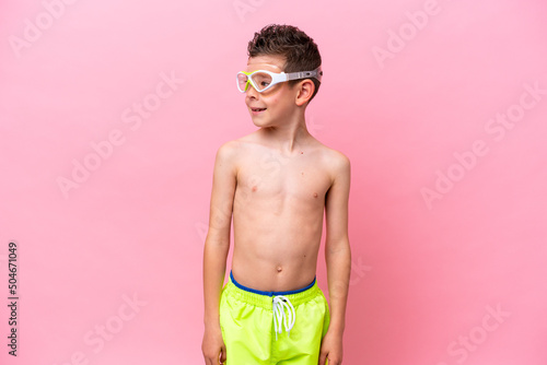 Fototapeta premium Little caucasian boy wearing a diving goggles isolated on pink background looking side
