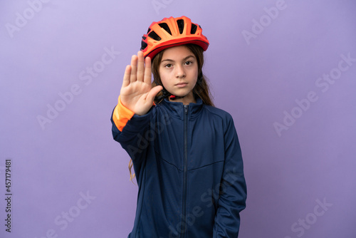 Fototapeta premium Little caucasian girl isolated on purple background making stop gesture