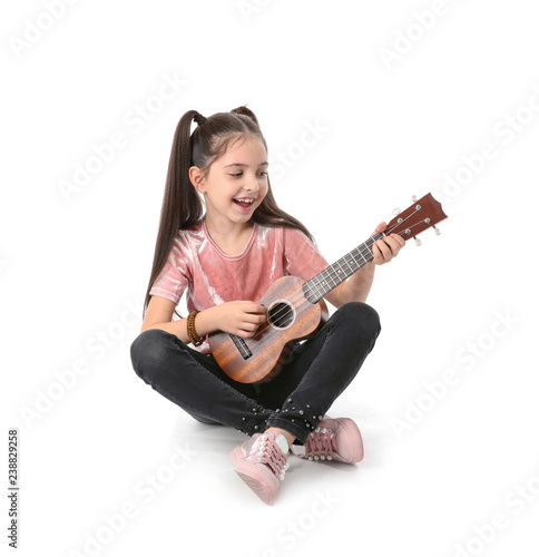 Naklejka premium Little cheerful girl playing guitar, isolated on white