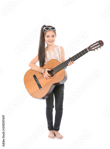 Obraz premium Little cheerful girl playing guitar, isolated on white