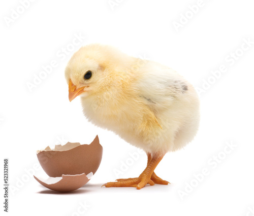 © Dmytro Titov, Obraz premium Little chick with egg shell isolated on white background