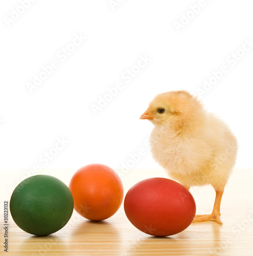 © Arpad Nagy-Bagoly, Fototapeta premium Little chicken with dyed easter eggs