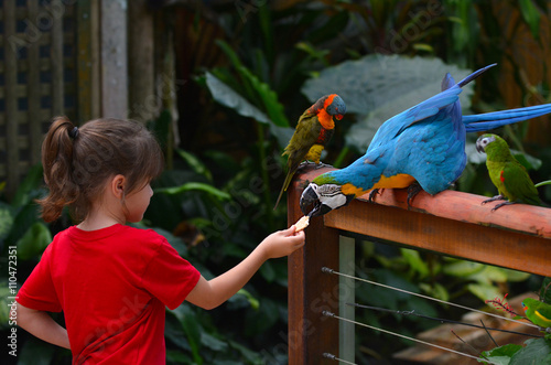 © Rafael Ben-Ari, Fototapeta premium Little child feeds a Blue and Gold Macaw