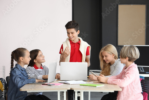 © Pixel-Shot, Fototapeta premium Little children studying with devices at school computer lab