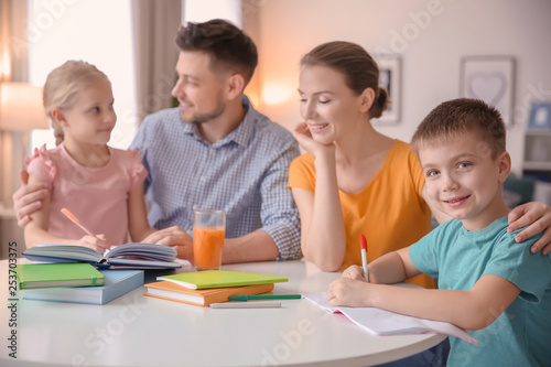 Fototapeta premium Little children with parents doing homework at home
