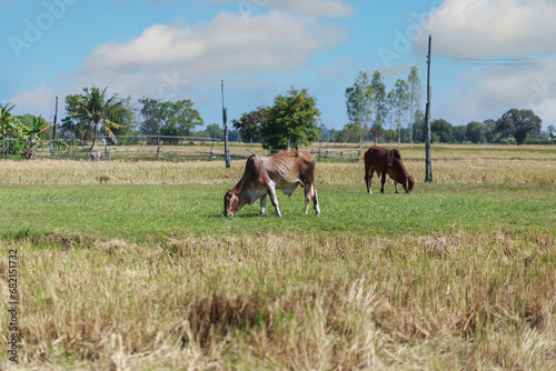 © Bankphotographer, Naklejka premium Little cow on the grass area of farmland.