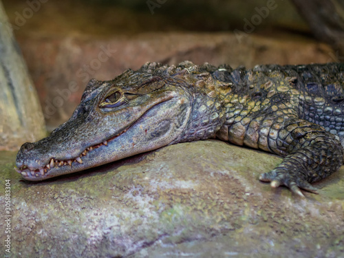 © Andrey, Obraz premium Little crocodile lies on a stone in a zoo