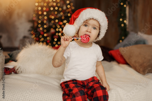 Obraz premium Little cute baby in Santa Claus hat is sitting in the room on the background of the Christmas tree and eating sweet candy on a stick