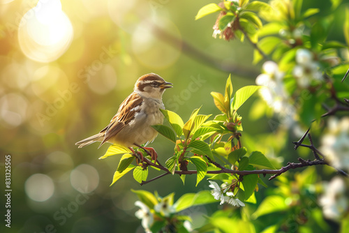 Naklejka premium Little cute bird happily singing on blooming spring holiday season tree branch, sunshine green background, sunny weather.
