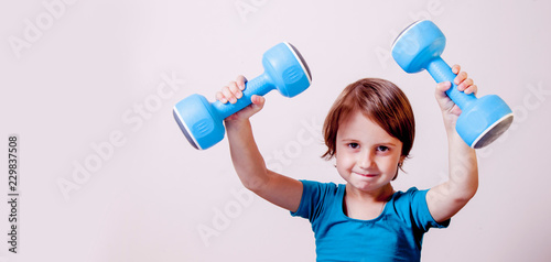 © zwiebackesser, Naklejka premium Little cute female sportler with dumbbells as symbol of best investment in health of children in future. Winner, fitness, sport, training, lifestyle concept.