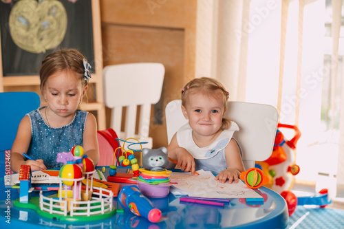 Fototapeta premium Little cute girls play in the room. Development and social learning
