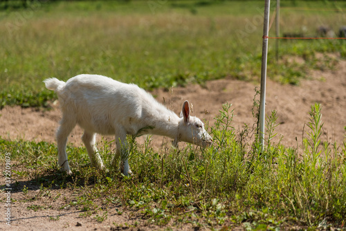 © nikolaskus, Fototapeta premium Little cute goat playing in nature in summer