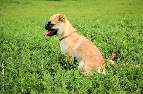 Obraz premium Little dog of red color, Proty Petit Brabancon looks to the side