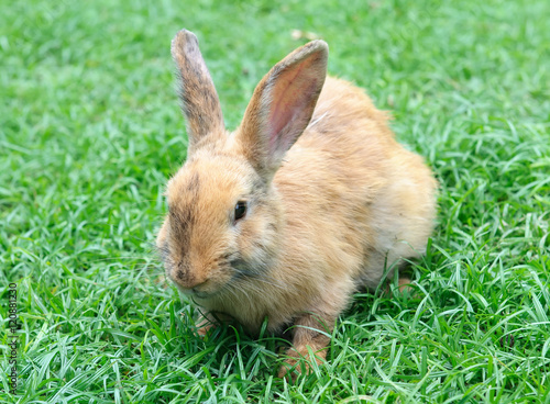 Fototapeta premium Little domestic rabbit on a green grass