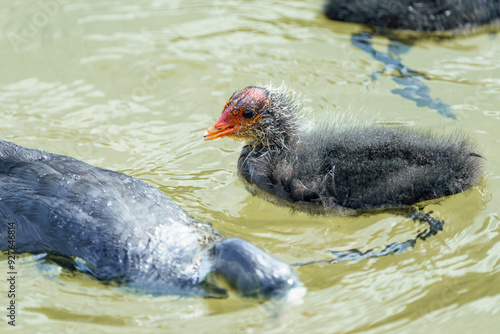 © andov, Fototapeta premium Little ducklings swim on the water in search of food.