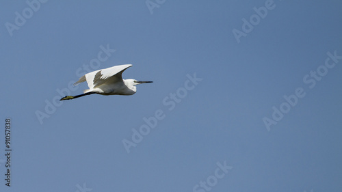 © PACO COMO, Fototapeta premium Little egret flying isolated in blue sky