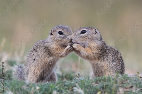 © Monikasurzin, Fototapeta premium Little european ground squirrel sitting in the grass. (Spermophilus citellus). Two young ground squirrel are kissing. Wildlife scene from nature.