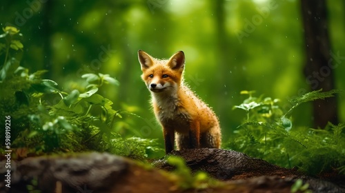 Fototapeta premium Little Fox In Rain Forest, Image Ai Generated