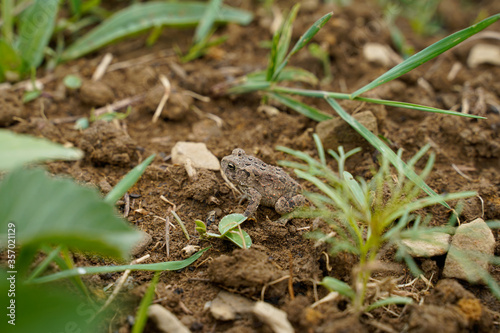 Fototapeta premium Little frog in the garden. Brown frog.